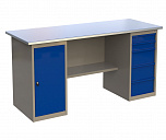Верстак двухтумбовый поставляется в разобранном виде (4 элемента). Нагрузка на столешницу до 600 кг. Стандартный цвет: корпус - серый глянец RAL 7030, ящики и двери тумб - синий RAL 5017. Размеры:855x1400x700 мм. Масса: 116 кг.