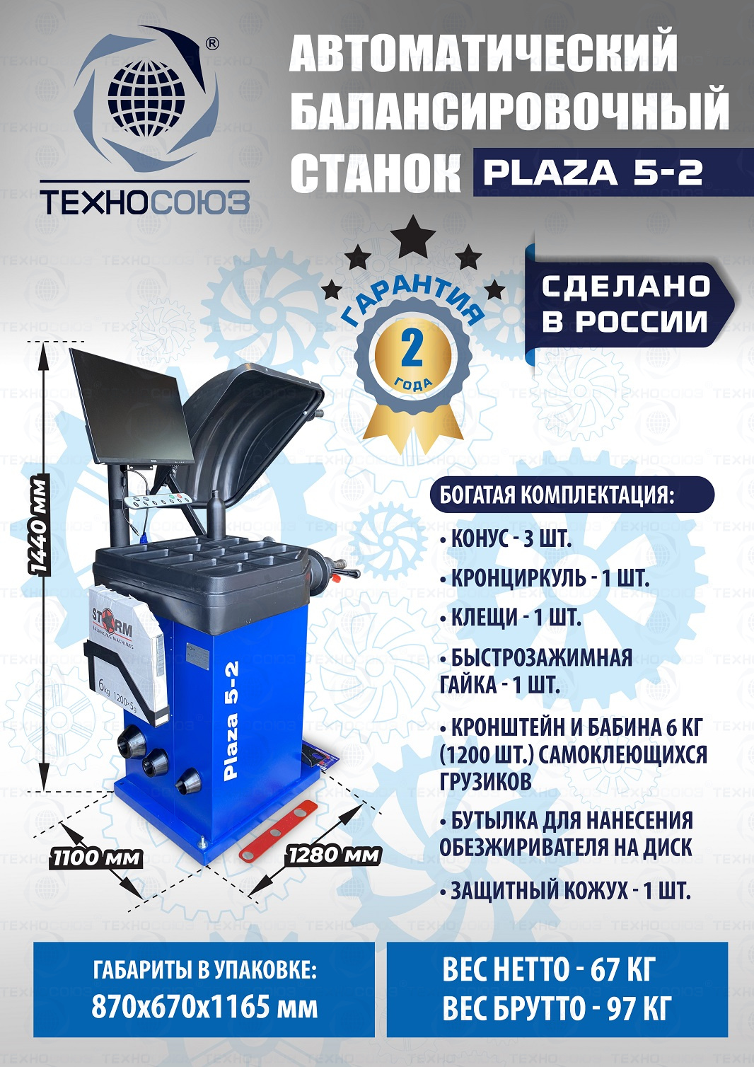 ПРОИЗВОДСТВО РФ. Автомат. Балансировочный станок Plaza 5-2. LCD монитор 21 дюйм. Автоматический доводчик, следящий привод. Автоматическое закручивание гайки. Электронная линейка. LED подсветка (4 линзы). Многофункциональная педаль. Функция MEMORY позволяет вести статистику работы станка (количество запусков, количество положительных результатов, сумма потраченных за единицу времени набивных и клеящихся грузов). Оснащен лазерным указателем положения места установки. Многофункциональная педаль. Вал 40 мм шлифованный. Для колёс легковых авто и коммерческого транспорта с диаметром диска с резиной до 980 мм. Размеры диска: ширина 1,5–20” , диаметр диска 9–24”. Вес колеса 65 кг.  Гарантия 2 года.