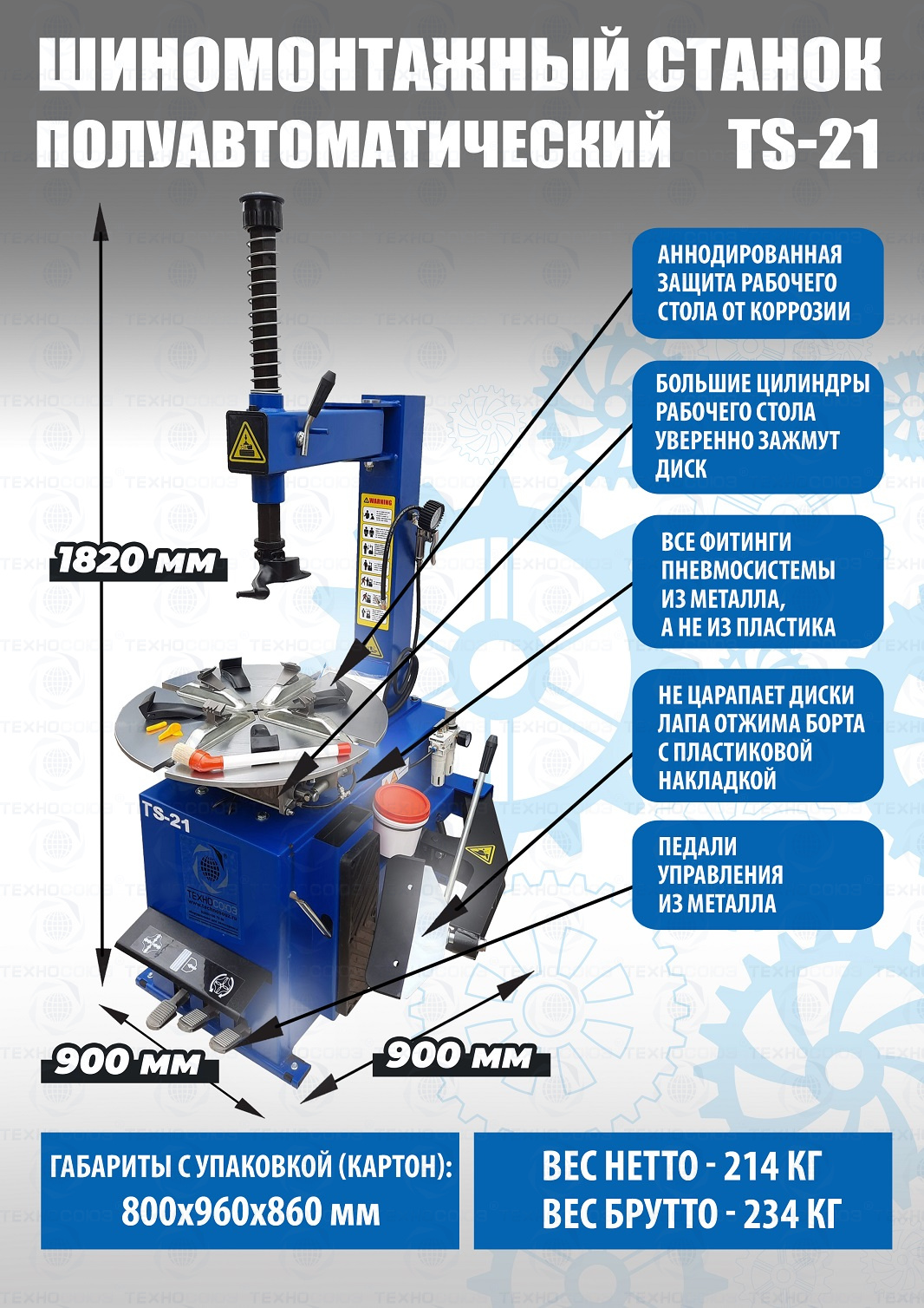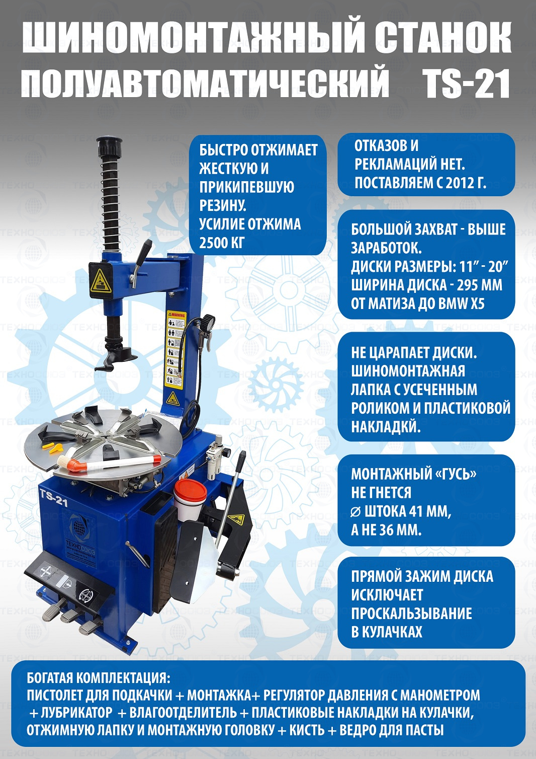 полуавтоматического шиномонтажного стенда TS-21, для колёс 99% автопарка России. От Матиза до Land Cruiser 200, Спринтеров, Газелей и пр. Для дисков: внешний 11÷18”, внутренний 12÷20”. Большой круглый стол Ø 560мм. В комплекте: пистолет для подкачки шин + монтажка + пластиковые накладки на зажимные кулачки + регулятор давления с влагоотделителем и манометром. Может комплектоваться «третьей рукой» для работы с низким профилем (опция). Очень надёжный шиномонтажный станок, рекомендуем. Напряжение шиномонтажных станков 220В или 380В на выбор.