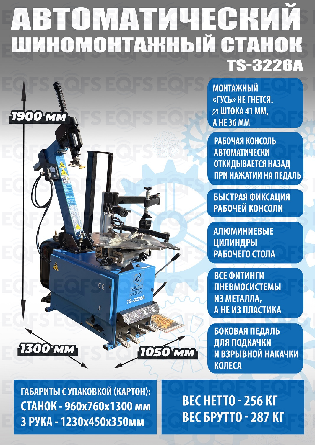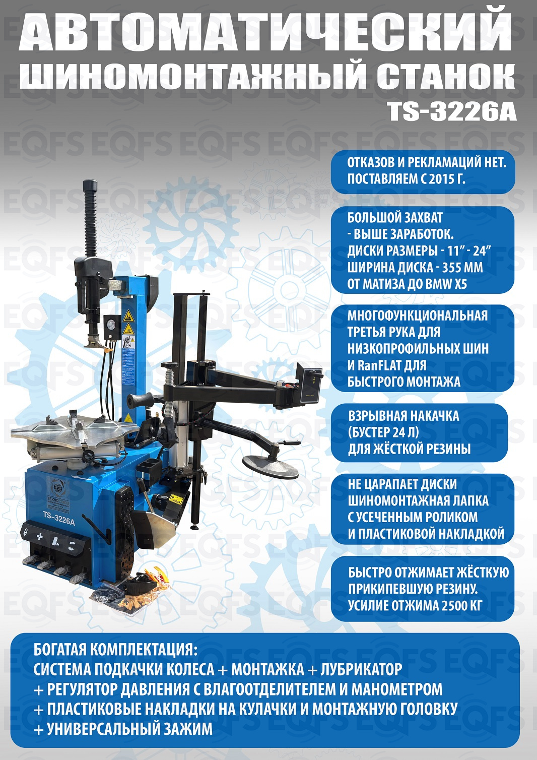 Автоматического шиномонтажного стенда TS-3226А предназначен для монтажа и демонтажа шин легковых автомобилей, внедорожников и легких грузовиков с размером колес от 11-24 дюйма. Усилие пневмоцилиндра в 2500 кг. В комплекте: полноценная 3-я рука для работы с жесткой и низкопрофильной резиной RUNFLAT. + встроенный бустер  24 литра (взрывная подкачка) + пистолет для подкачки шин + монтажка + регулятор давления с влагоотделителем и манометром. Напряжение шиномонтажных станков 220В или 380В на выбор. Гарантия 18 мес – наш монтаж, 12 мес – самостоятельная установка.