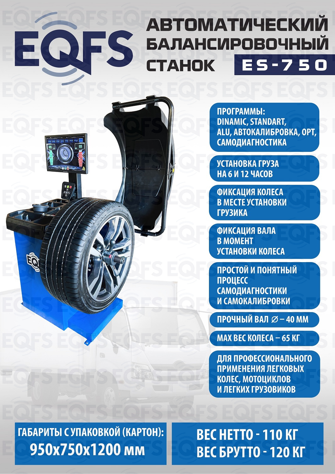ES-750 Автоматический балансировочный станок. Автодоводчик и лазерная указка места установки грузика. Автоматический ввод 3-х параметров. Для колёс шириной 315мм, Ø до 800мм и весом до 65кг. Диски ширина 3–10” (76-254 мм) , диаметр 10–24” (254÷609 мм)   Программы: статическия и динамическая балансировка, ALU, OPT, SPLIT, калибровка и самодиагностика. LCD монитор 19 дюймов. Вал Ø - 40мм. Для балансировки колёс легковых автомобилей, мотоциклов, лёгких грузовиков и широких колёс. Гарантия 18 мес – наш монтаж, 12 мес – самостоятельная установка.