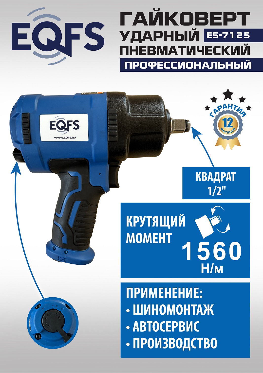 ES-7125 Пневмогайковерт 1/2". ПРОФЕССИОНАЛЬНЫЙ. Позволяет открутить сильно прикипевшую гайку или болт. Устойчив к перегрузкам - работает на индустриальных подшипниках. Ударопрочный - изготовлен из морозо/ударо- устойчивого пластика (облегченный композитный корпус). Обрезиненная рукоятка. Реверс, регулировка крутящего момента – 3 режима. Под головку 1/2”. Крутящий момент 1560 Нм. ВЕС-2,0 кг.