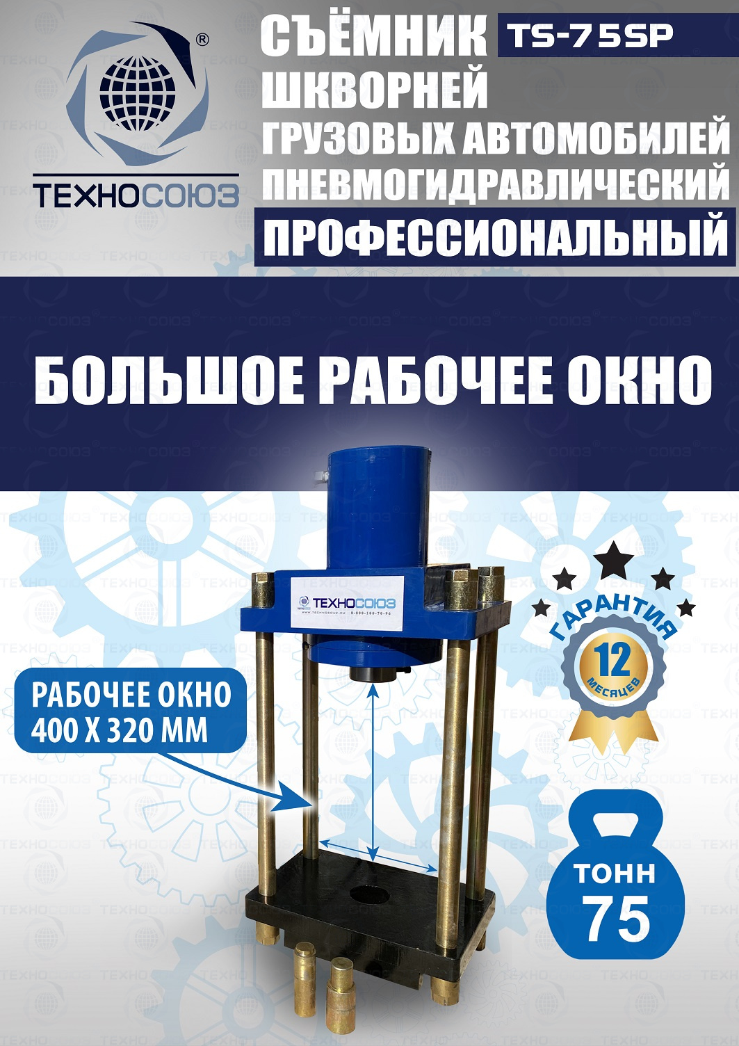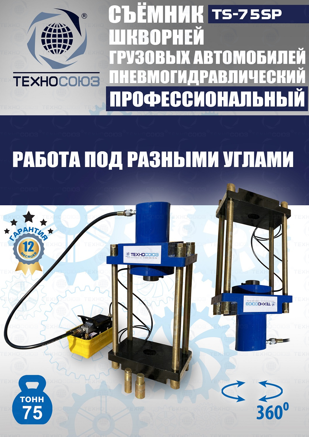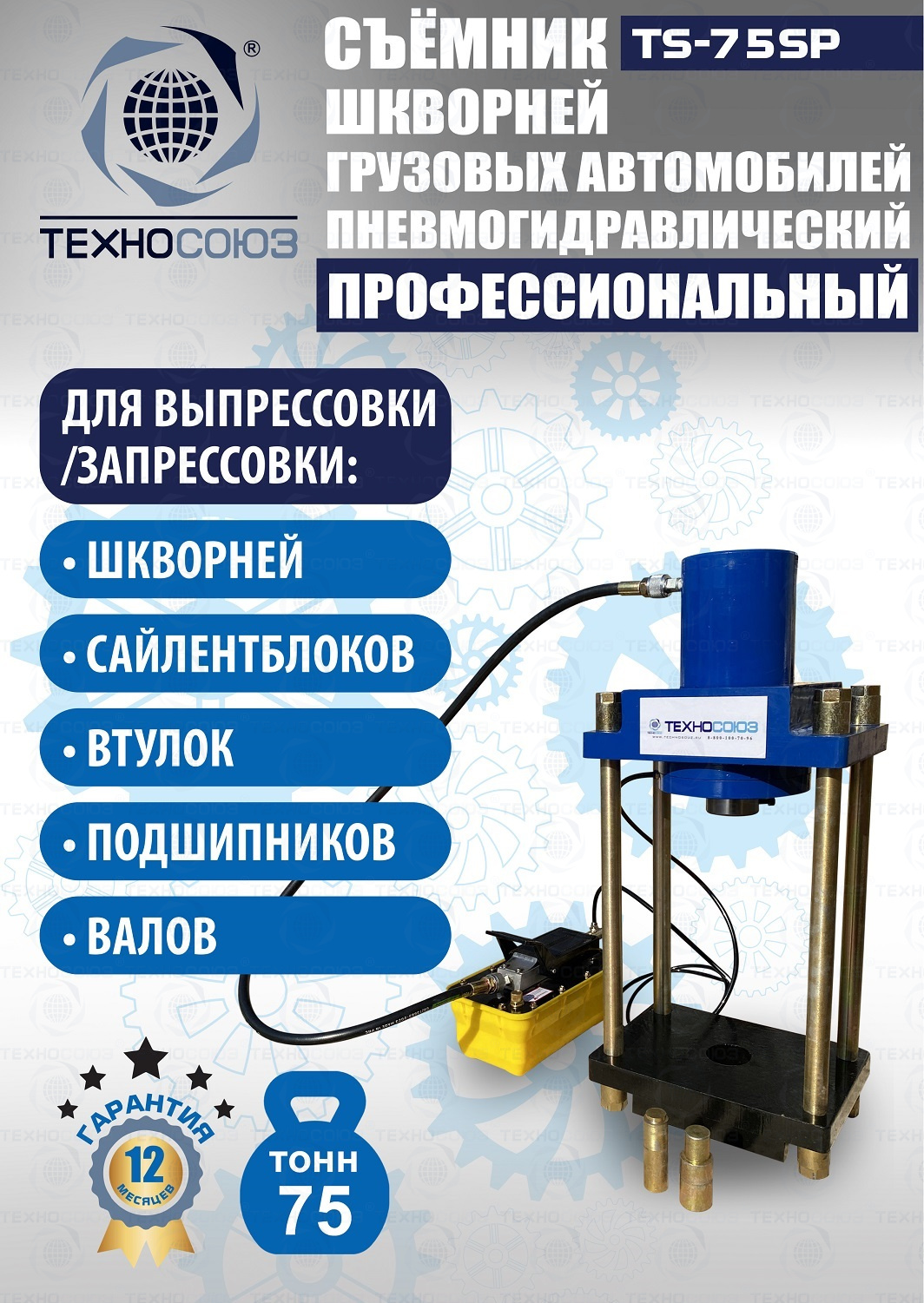 Сокращает время ремонта. Позволяет работать под разными углами. Для выпрессовки шкворней из поворотной цапфы погрузчиков, тракторов, строительной техники, коммерческих и грузовых авто отечественного и импортного производства: MAN, MERCEDES, SCANIA, VOLVO, Корейские и Китайские авто. Пневмогидравлический привод. Рабочее окно 400x320 мм. Усилие 75 тонн.