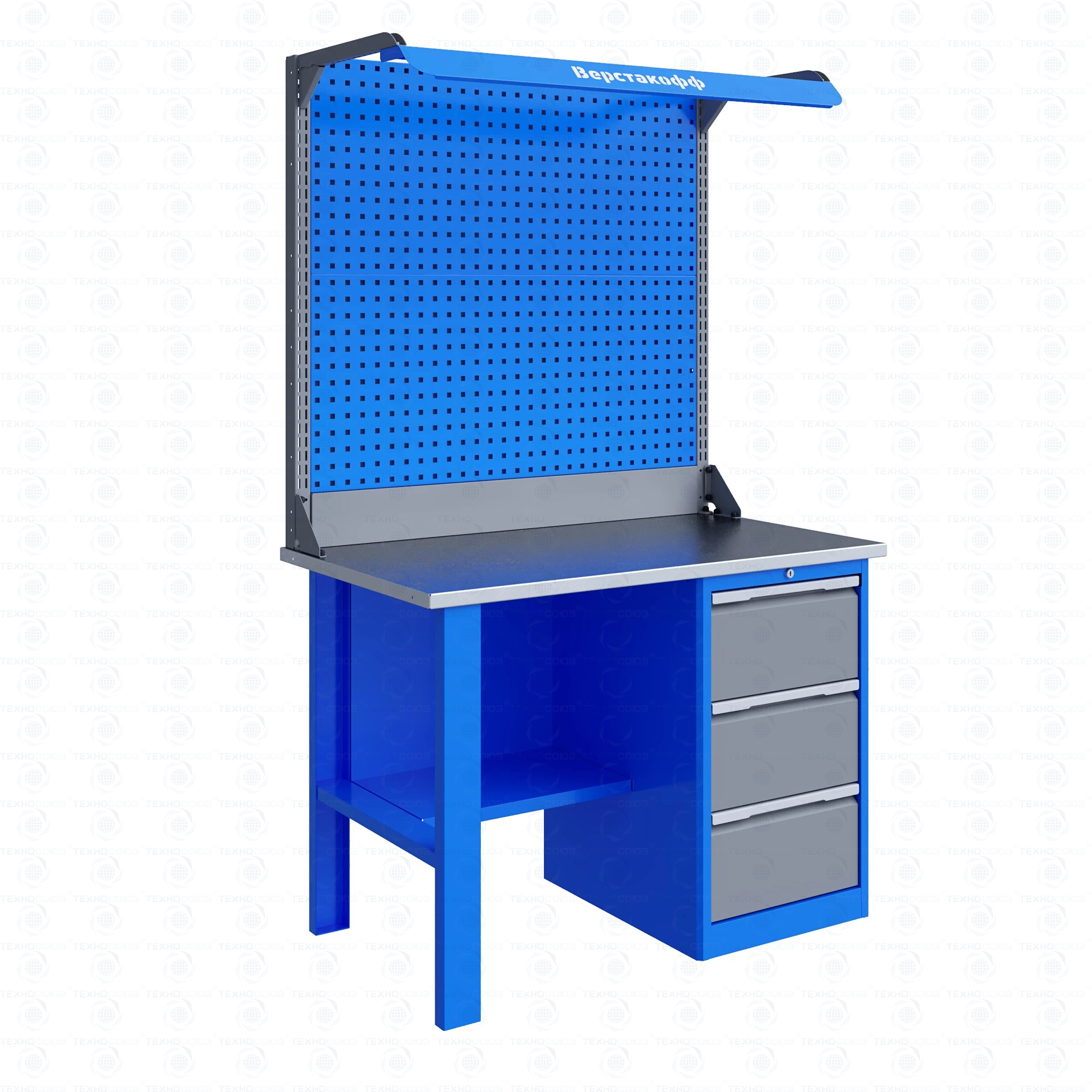 Однотумбовый. Допустимая нагрузка на столешницу 750 кг. Опорные элементы выполнены сварными из холоднокатаной стали. Верстак состоит из столешницы, опоры, тумбы P3 с тремя большими ящикам, полки-стенки, двойного экрана с кронштейнами и комплекта освещения. Все металлические элементы покрыты полиэфирной порошковой краской. Столешница состоит из фанеры марки ФСФ толщиной 24 мм, которая покрыта лаком-антисептиком и листом оцинкованной холоднокатаной стали толщиной 1,2 мм. Размеры (ВхШхГ) 1965x1196x696 мм.