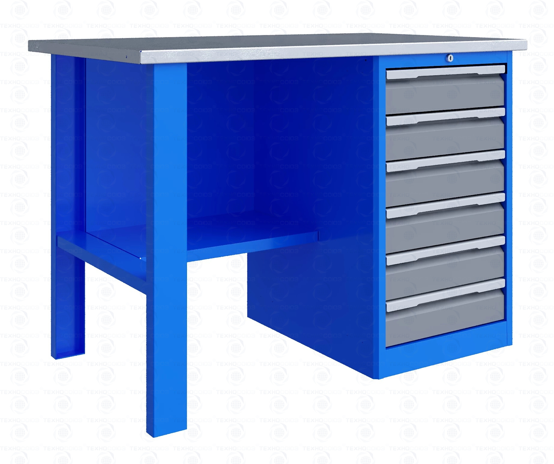 Тумба верстака - сварная. Ящики в тумбе устанавливаются на шариковых телескопических направляющих полного выдвижения. В тумбе P6 установлено шесть малых ящиков. Внутренние размеры малых ящиков (ВхШхГ), не более: 103 х 397 х 520 мм. Внутренние размеры больших ящиков (ВхШхГ), не более: 222 х 397 х 520 мм. Тумбы с ящиками снабжены общим центральным замком с поворотом ригеля 180 градусов и подпружиненной тягой. В комплекте два ключа.